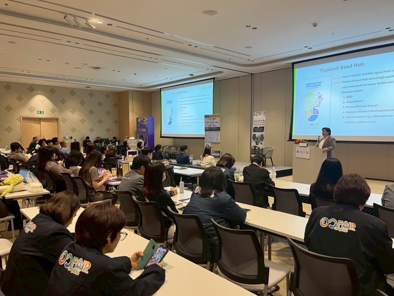 ผศ.ดร.ชัชมาศ กาญจนอุดมการ หัวหน้าศูนย์วิจัยและพัฒนาพืชผักเขตร้อน ภาควิชาพืชสวน คณะเกษตร กำแพงแสน ในนาม ผู้บริหารจัดการศูนย์รวมผู้เชี่ยวชาญด้านเมล็ดพันธุ์ผักของปรเทศไทย สำนักงานการวิจัยแห่งชาติ (วช.) กล่าวรายงาน และแนะนำศูนย์รวมผู้เชี่ยวชาญด้านเมล็ดพันธุ์ผักของประเทศไทย ในการเสวนาเรื่อง "เมล็ดพันธุ์ดีมีชัยไปกว่าครึ่ง: แนวทางสู่ความมั่นคงทางอาหารด้วยผักหลากหลาย” ในงาน อว.แฟร์ : SCI POWER FOR FUTURE THAILAND เมื่อวันที่ 13 สิงหาคม 2568 ณ ห้องประชุม MR210AB ศูนย์การประชุมแห่งชาติสิริกิติ์